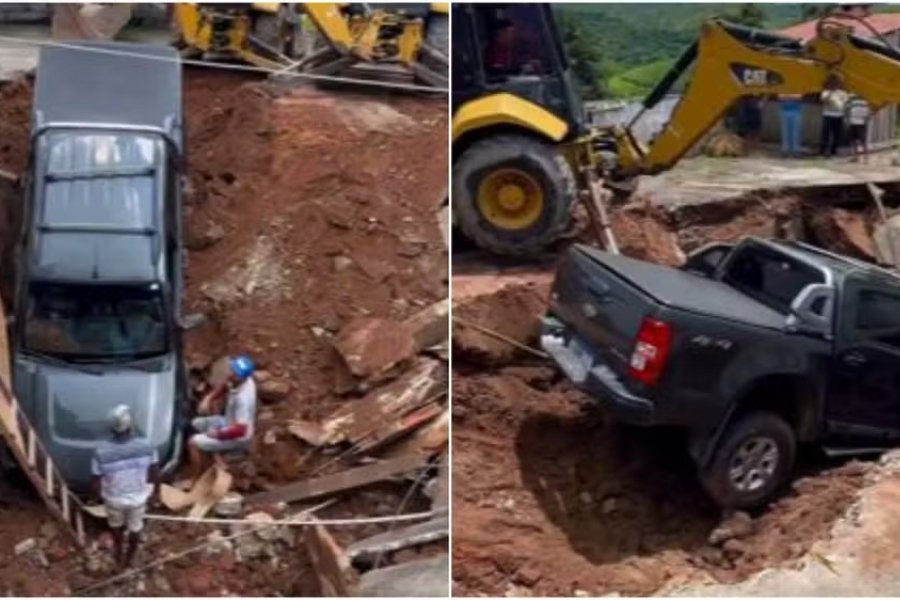 Para a remoção da caminhonete da cratera, foram empregadas duas retroescavadeiras. Após a retirada, o veículo foi encaminhado a uma oficina através do seguro.