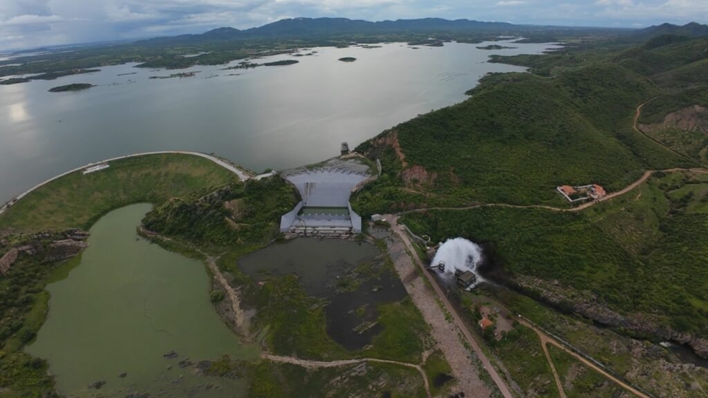 O Açude Orós, que ocupa a posição de segundo maior reservatório do estado, voltou a sangrar recentemente. Imagens capturadas por drone mostram o transbordamento das águas, que irrigam a área circundante.